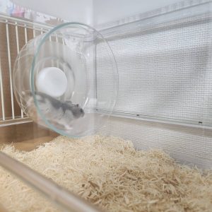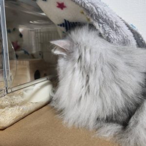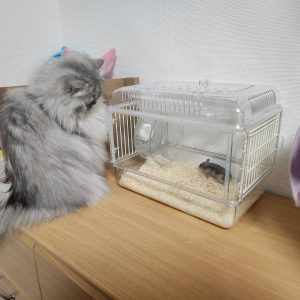 ゲージ内をちょこまか動くハムスターが気になるのか、動いてる間はずっとゲージ内を眺めているおもちちゃん……👀